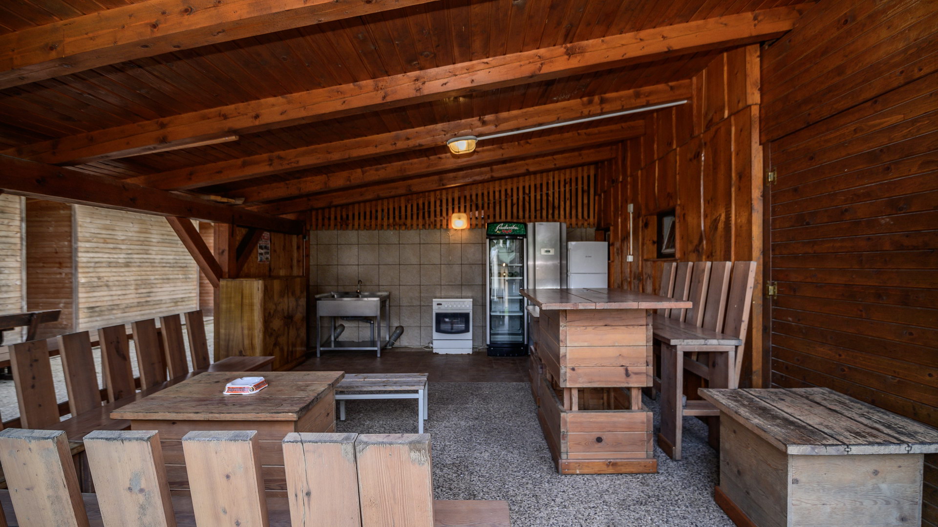 The hostel is located at the beginning of the camp. The central large building has 5 rooms, 3 double rooms and two rooms for 4 people. There are also showers, toilets, and washbasins in the building. Outside there is a kitchen, barbecue, and dining area. Behind the building is a space for socializing with a prepared campfire. Next to the main building, the hostel has 5 wooden cottages. Four cottages have 4 beds (bunk beds) and one has two beds. Outside the main building, there is a large covered dining area with a kitchen, a refrigerator with a freezer compartment, and a barbecue.