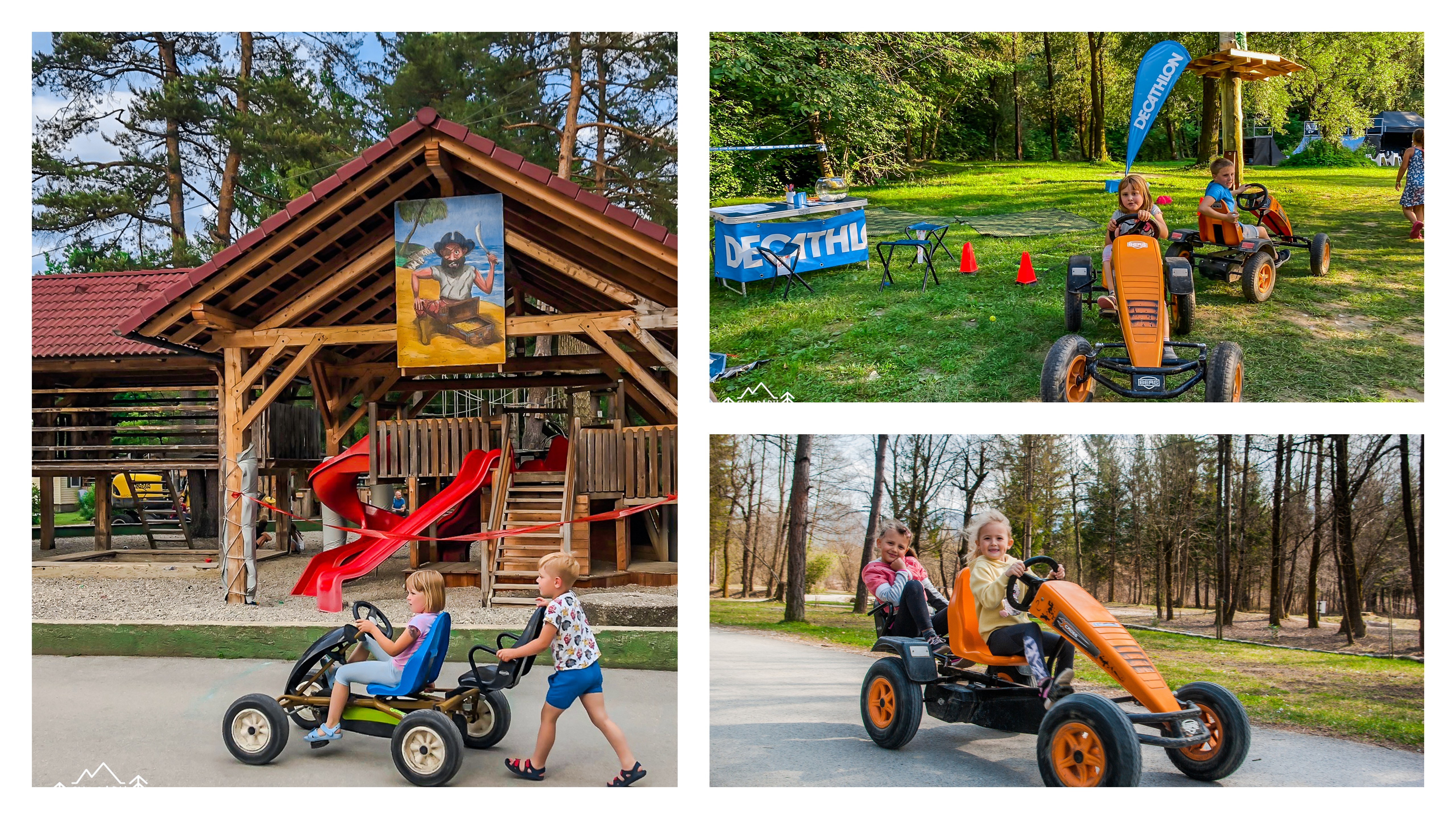 Med najbolj priljubljenimi aktivnostmi v kampu za otroke so gokarti, a tu ne gre za kakšne glasne in smrdeče bencinske gokarte – v skladu z naravno usmeritvijo kampa so gokarti popolnoma ekološki, saj jih poganjajo pedali. Kljub temu, so hitrosti, ki jih mali dirkači razvijejo impresivne. Gokarte si je mogoče izposoditi v Funparku Menina (raft garaža). Primerni so le za otroke in ne odrasle.