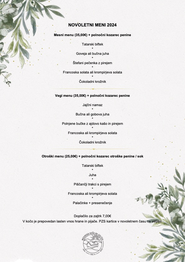 Novoletna večerja bo postrežena ob 20.00 uri, izbirate lahko med mesnim ali vegi menijem, posebej smo pripravili tudi meni za otroke. Ob polnoči bomo skupaj dočakali novo leto s kozarcem penine in s pogledom na ognjemet v dolini.